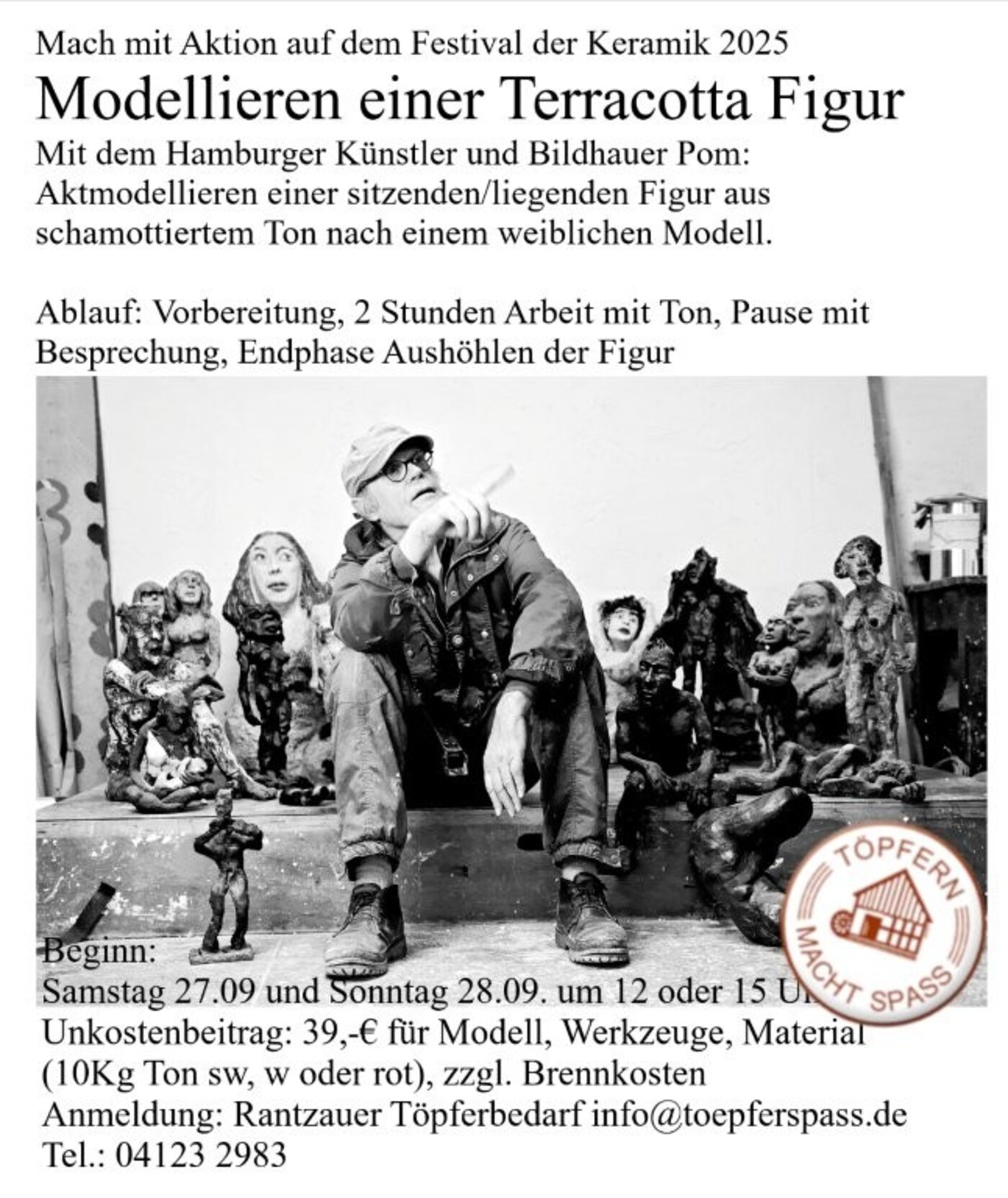 mit dem Hamburger Künstler Pom. Aktmodellieren einer sitzenden/stehenden Figur aus schamottiertem Ton nach einem weiblichen Modell. Ablauf: 2 Stunden Arbeit mit Ton, Pause mit Besprechung, Aushöhlen der Figur.